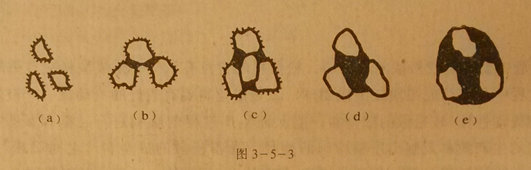 存在于粉粒體中的液體,可分為粒子內液與粒子外液,粒子內液包括存在于粒子內部空隙或孔洞的液體和化學結合的液體.粒子的外液,可有以下幾種情況。見圖3-5-3.